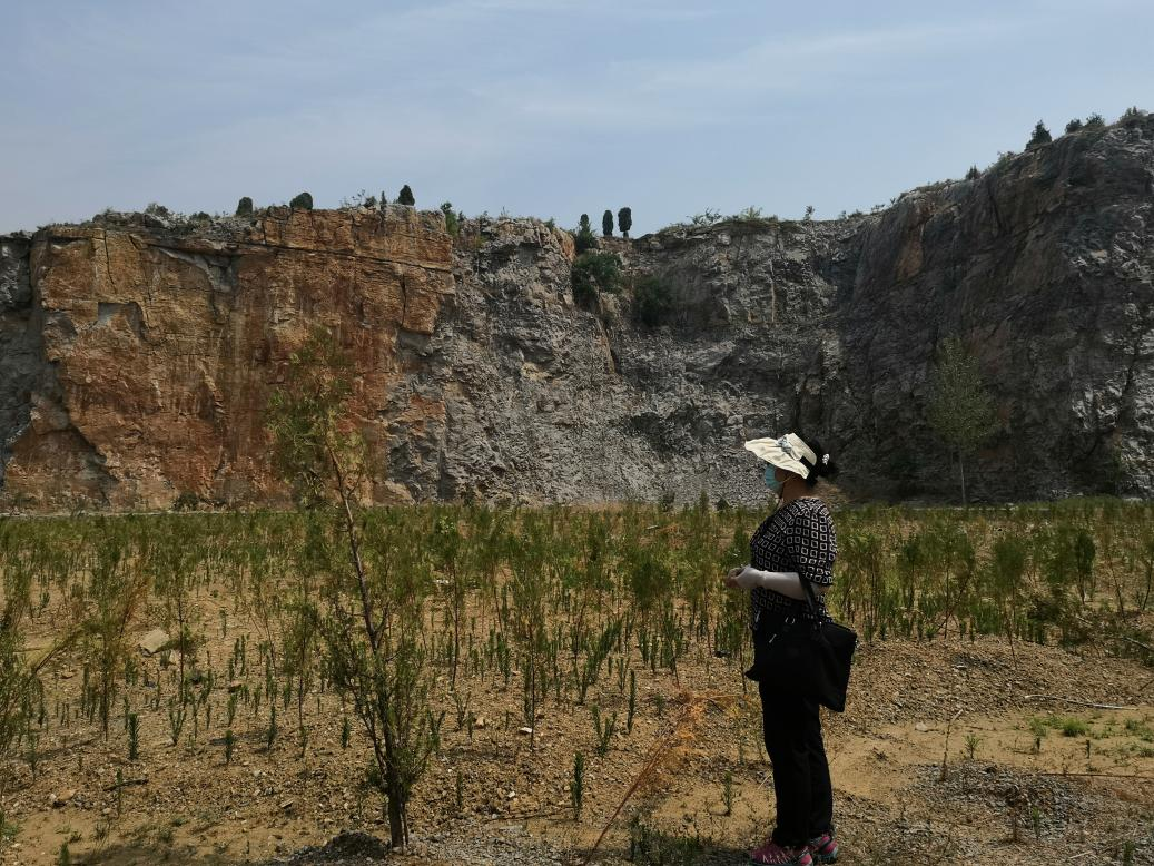 (周慧云在山上勘察山体保护和苗木补偿情况)