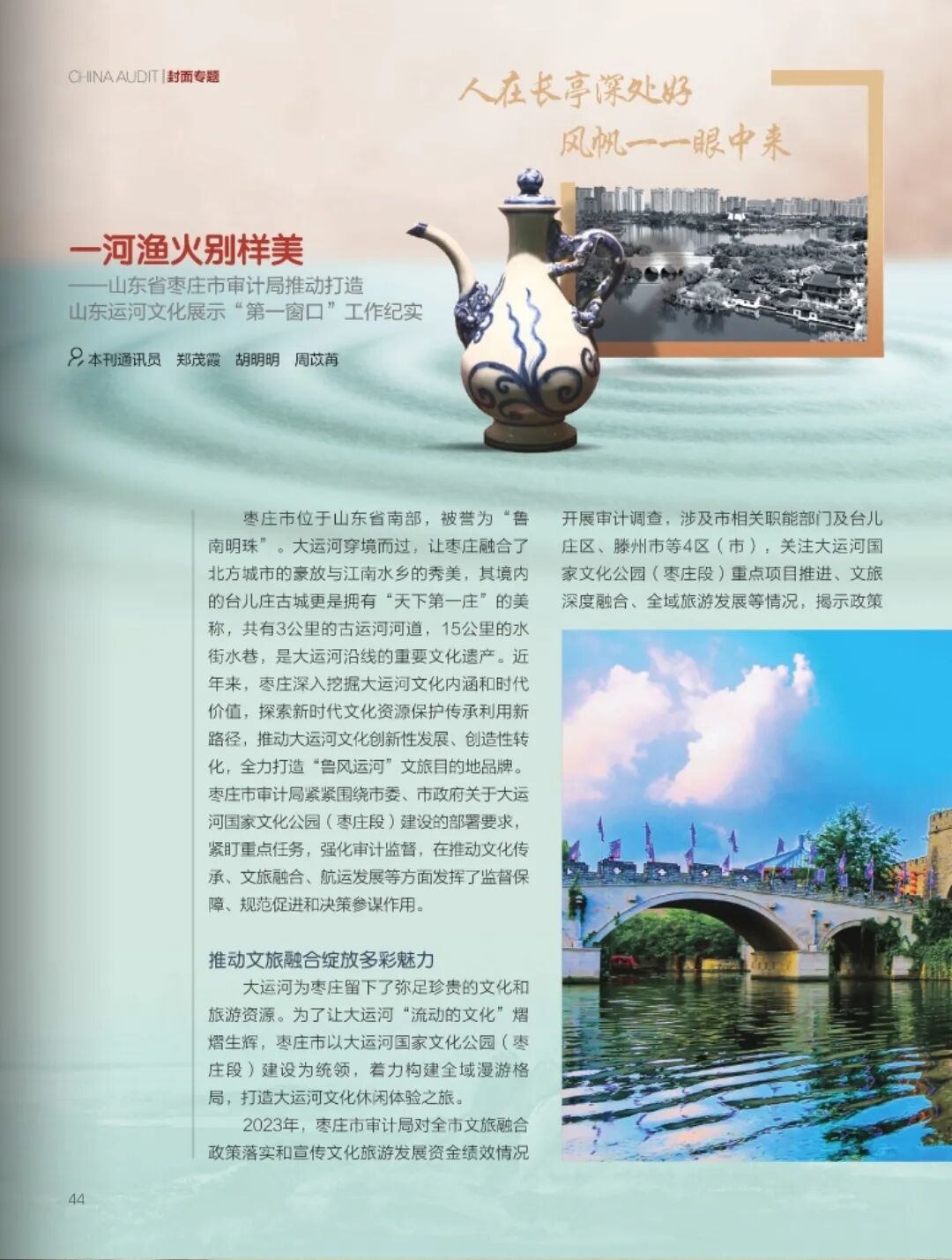 按:《中国审计》杂志2025年第15期“封面专题”刊发了浙江、江苏、山东、河北等省大运河沿线审计机关服务大运河文化保护传承利用审计工作。杂志以《一河渔火别样美》为题报道了枣庄市审计局推动打造山东运河文化展示“第一窗口”工作,原文如下,现予转发。