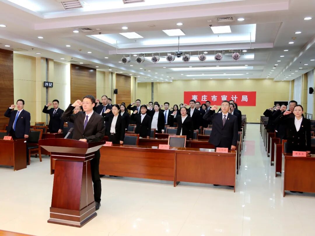 在宣誓环节,市审计局党组书记、局长房栋左手抚按《中华人民共和国宪法》,右手举拳,宣读誓词,全体审计人员右手举拳,跟诵誓词。誓言铿锵,掷地有声,充分展现了审计干部弘扬宪法精神、忠于审计事业的坚定决心。